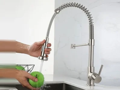 شیر ظرفشویی علم فنری، نوعی شیر است که دارای یک بازوی متحرک و فنری است. این شیرها به جای شلنگ از یک علم فنری استفاده میکنند که قابلیت انعطاف بالایی دارد و به شما اجازه میدهد تا به راحتی به تمام نقاط سینک دسترسی داشته باشید. سر دوش این شیرها معمولاً قابل تنظیم است و حالتهای مختلفی مانند دوش، اسپری و آبفشان را ارائه میدهد.