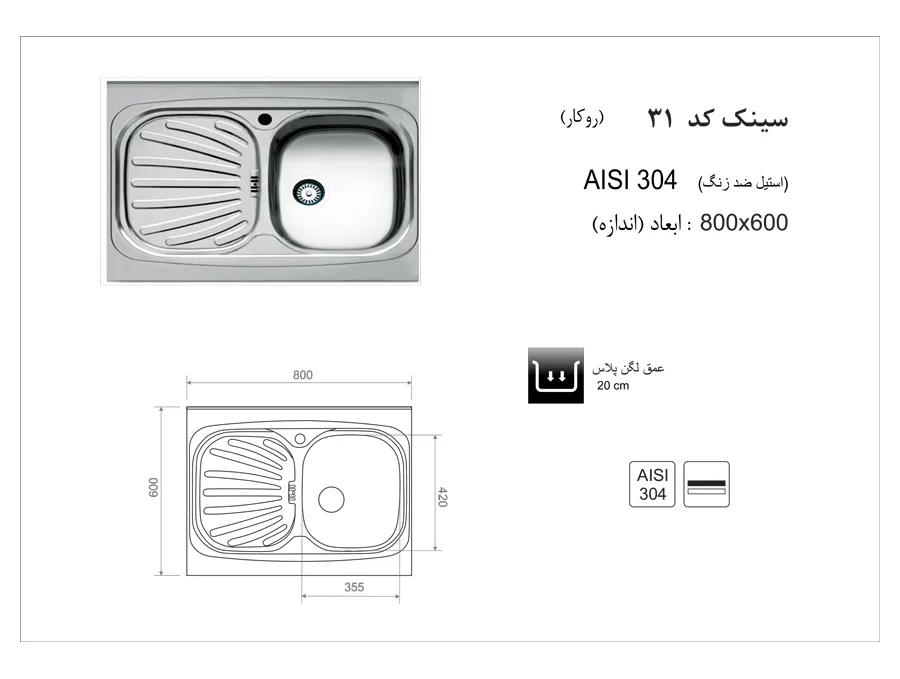 دسته: سینک ظرفشویی, سینک اخوان, سینک تک لگن, سینک روکار
