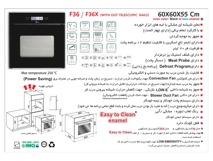 شیشه ایتالیایی ,دارای سینی پخت و پز ,نحوه باز شدن درب به صورت افقی ,دارای شلف استیک پز ترمز دار ,پوشش داخلی آسان تمیز شونده ,شیشه داخلی درب low-E بلژیک ,مجهز به سیستم پخت خودکار و نیمه خودکار ,المنت حرارتی برقی 1800 وات |