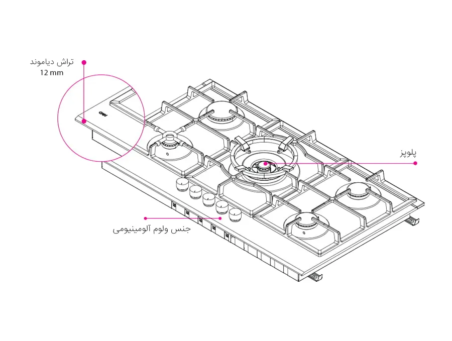 صفحه شیشه سکوریت ,توان حرارتی 10.4Kw شعله ها ,شیر کنترل ایرانی ,سرشعله ایرانی ,دارای ولوم آلومنیومی ,دارای شبکه چدنی لعابدار ,لوازم همراه محصول: تبدیل قهوه جوش ,عمق سینی اجاق گاز 51 میلی متر |
