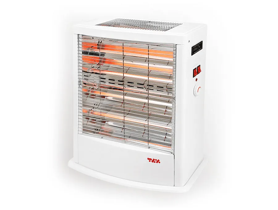 دارای 4 المنت در جلو و 2 المنت در سقف ,دارای ولوم تنظیم کننده درجه حرارت ,دارای ترموستات ,مجهز به سیستم قطع خودکار (ایمنی در صورت واژگونی) ,انتقال گرما از طریق جا به جایی و تابش ,جهت جریان گرما از جلو و بالا |