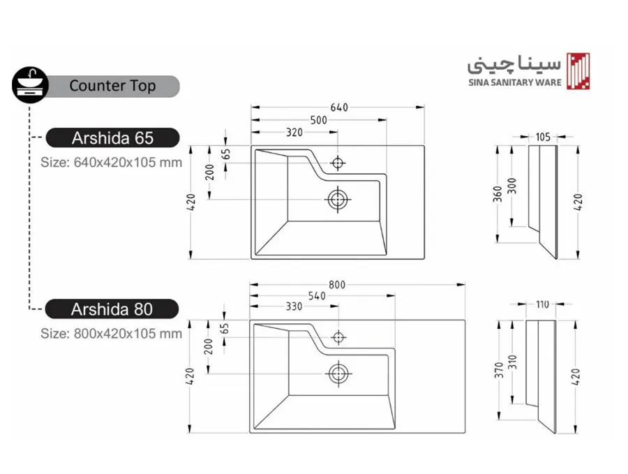مشخصات روشویی روسنگی سینا چینی مدل آرشیدا