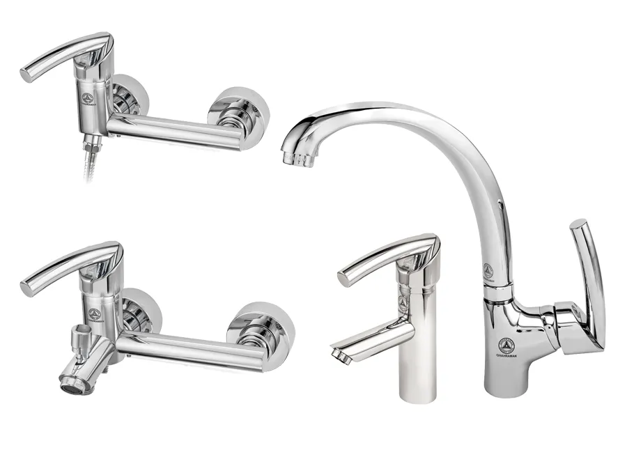 این ست شیرآلات شامل شیر ظرفشویی، شیر روشویی، شیر توالت و شیر حمام میباشد |