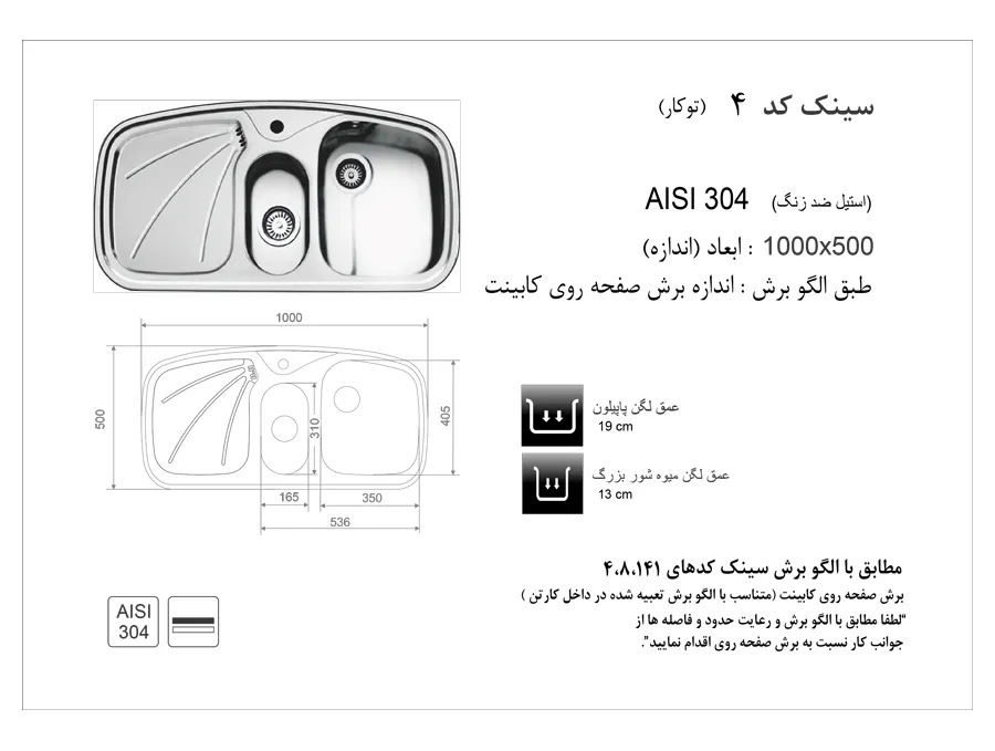 عمق لگن بزرگ 19 سانتیمتر ,عمق لگن کوچک 13 سانتیمتر ,دارای سیفون و زیرآب ,تکنیک آببندی نوار PU ,بست فلزی |