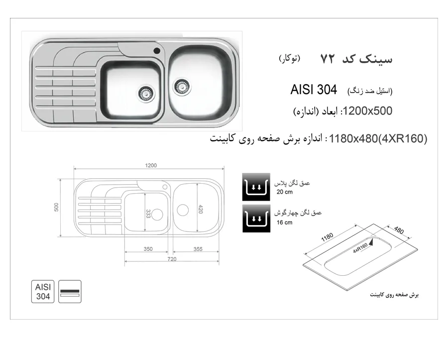 عمق لگن بزرگ 20 سانتیمتر ,عمق لگن کوچک 16 سانتیمتر ,دارای سیفون و زیرآب ,تکنیک آببندی نوار PU ,بست فلزی |