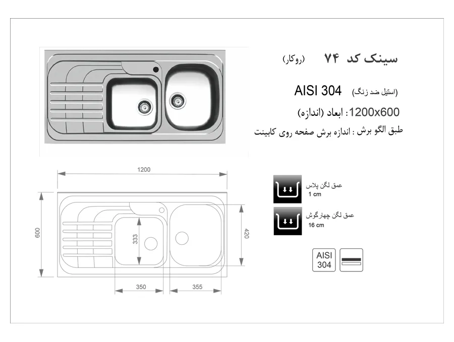 عمق لگن بزرگ 19 سانتیمتر ,عمق لگن کوچک 16 سانتیمتر ,دارای سیفون و زیرآب |