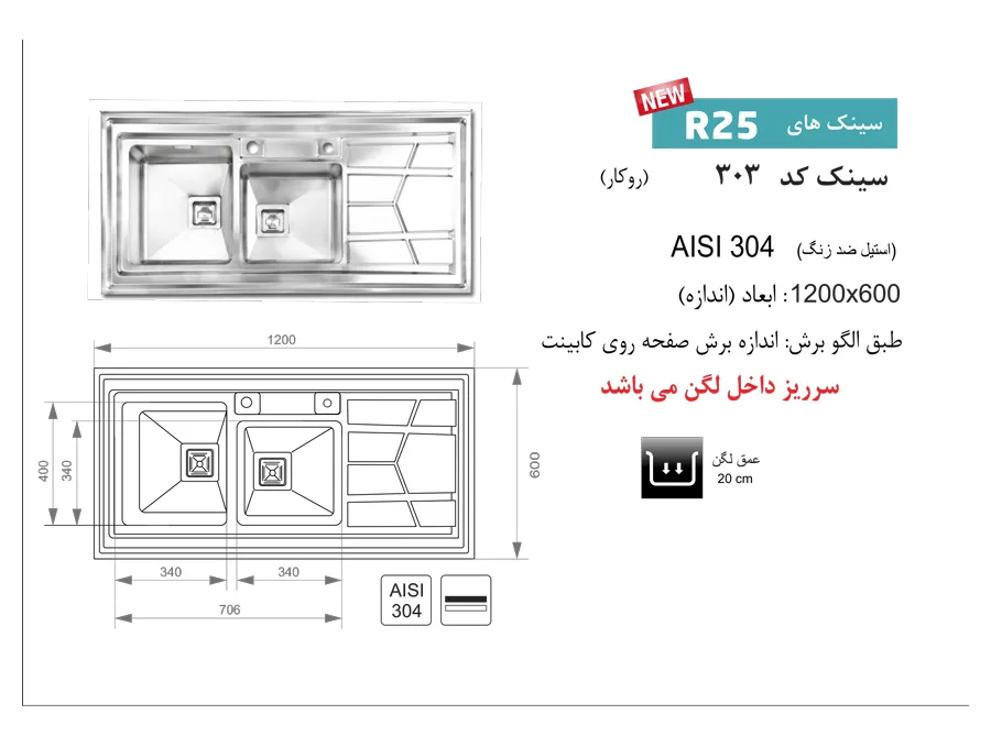 دسته: سینک ظرفشویی, سینک اخوان, سینک دو لگن, سینک روکار