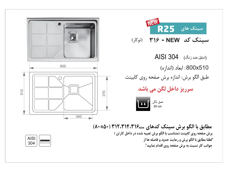 دسته: سینک ظرفشویی, سینک اخوان, سینک تک لگن, سینک توکار