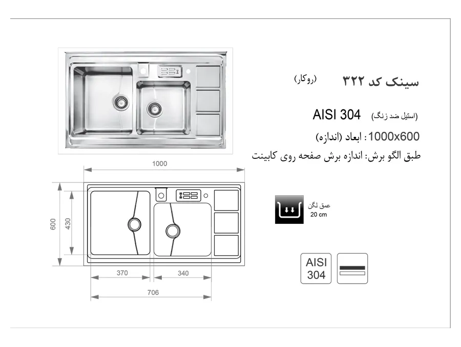 دسته: سینک ظرفشویی, سینک اخوان, سینک دو لگن, سینک روکار