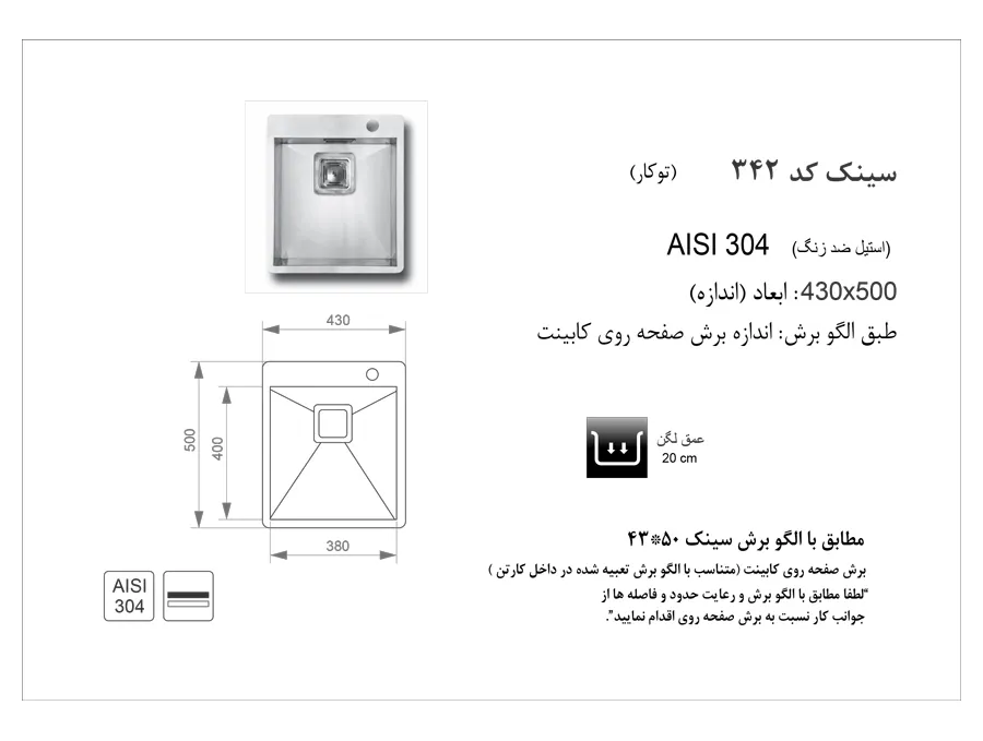 دسته: سینک ظرفشویی, سینک اخوان, سینک تک لگن, سینک توکار