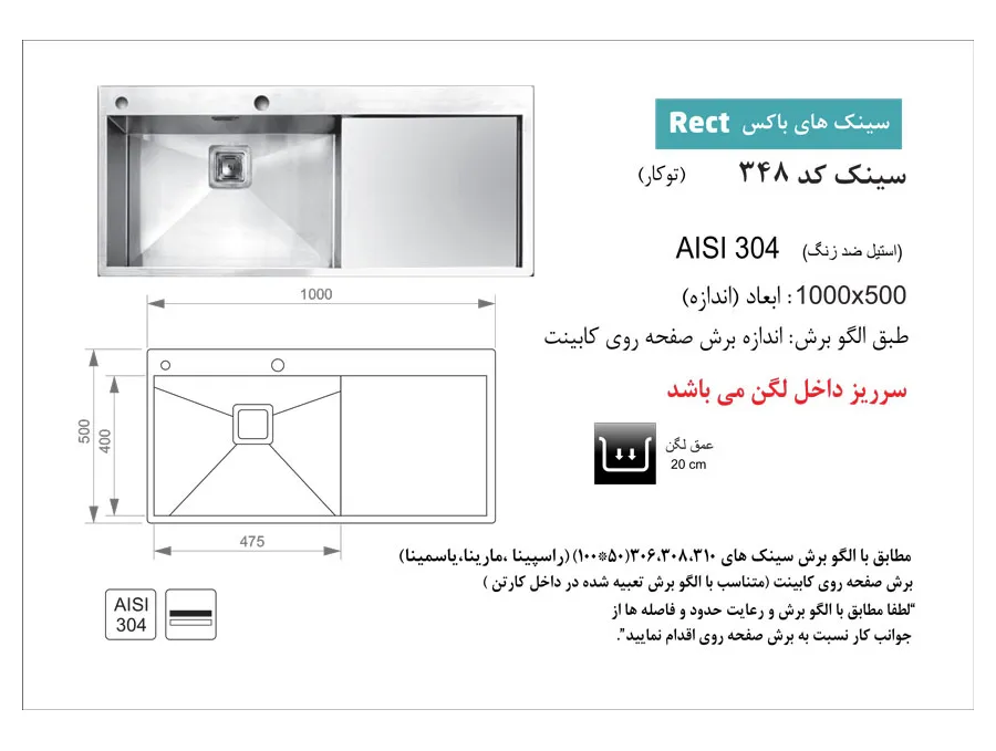 دسته: سینک ظرفشویی, سینک اخوان, سینک تک لگن, سینک توکار