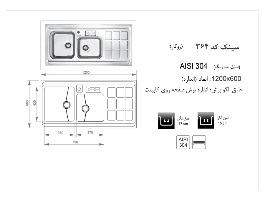 عمق لگن بزرگ 17 سانتی متر ,عمق لگن کوچک 15 سانتی متر ,دارای سیفون و زیرآب |