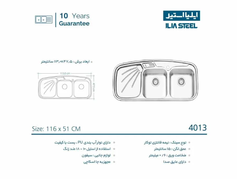 مشخصات سینک ایلیا استیل مدل 4013 توکار