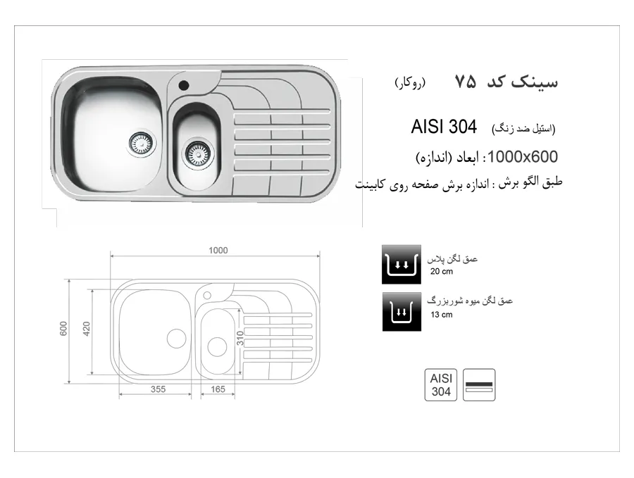 عمق لگن بزرگ 20 سانتیمتر ,عمق لگن کوچک 13 سانتیمتر ,دارای سیفون و زیرآب |