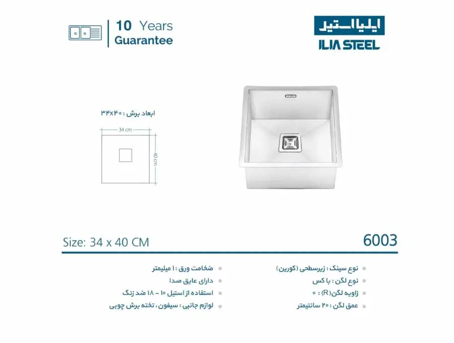 مشخصات سینک زیر کورین ایلیا استیل مدل 6003