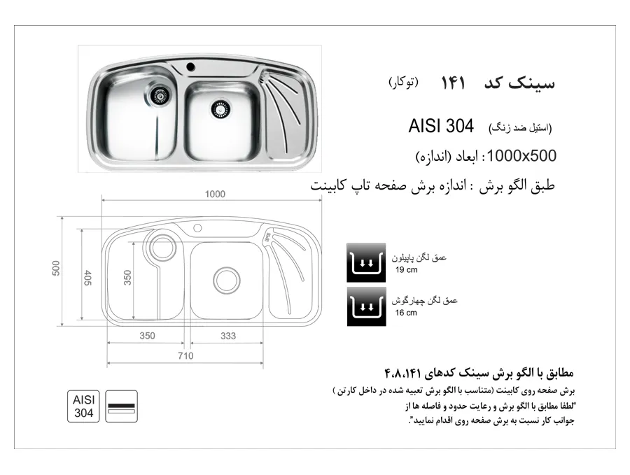 عمق لگن بزرگ 19 سانتیمتر ,عمق لگن کوچک 16 سانتیمتر ,دارای سیفون و زیرآب ,تکنیک آببندی نوار PU ,بست فلزی |