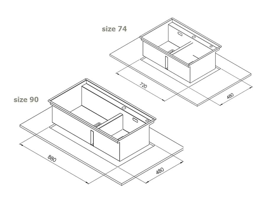 حجم لگن سایز 90 : 52 لیتر ,حجم لگن سایز 74 : 42 لیتر ,شعاع لگن صفر ,مدل نصب به صورت تاپ مانت و فلش مانت |