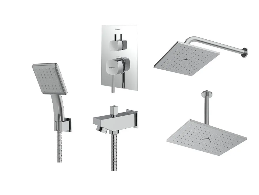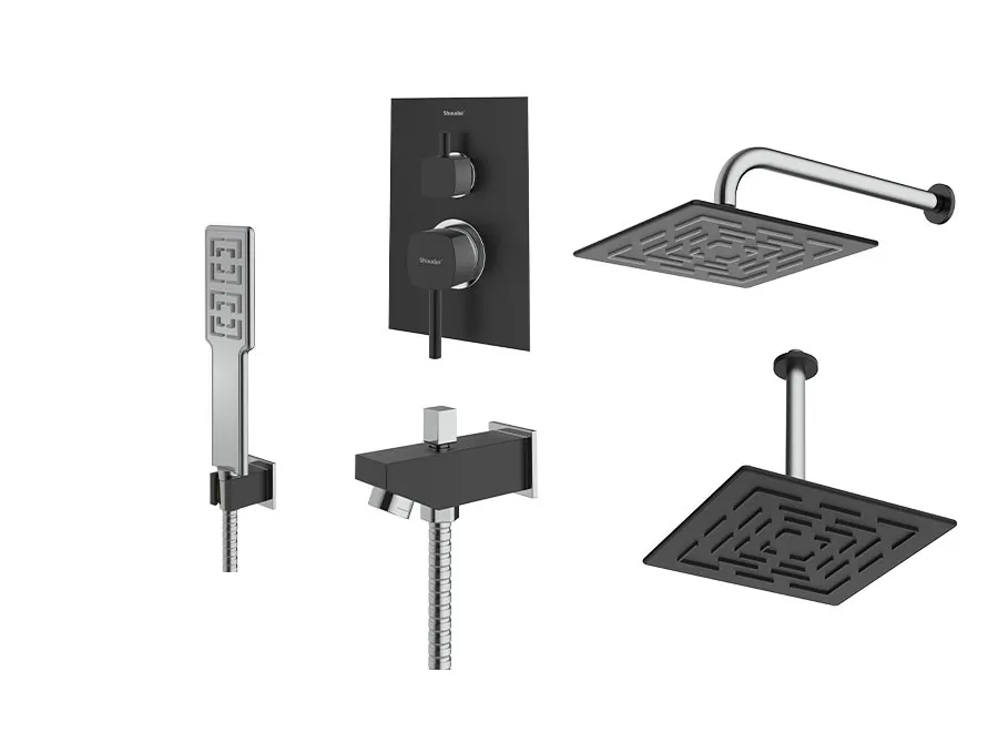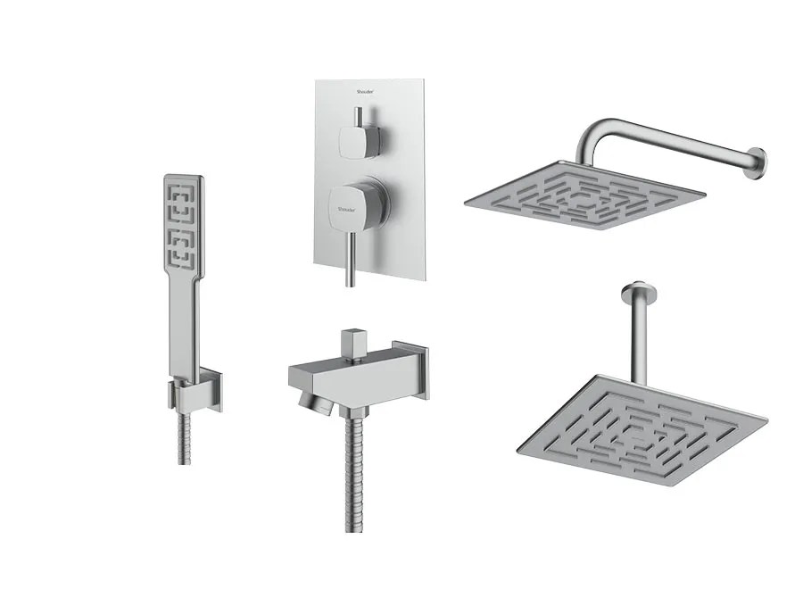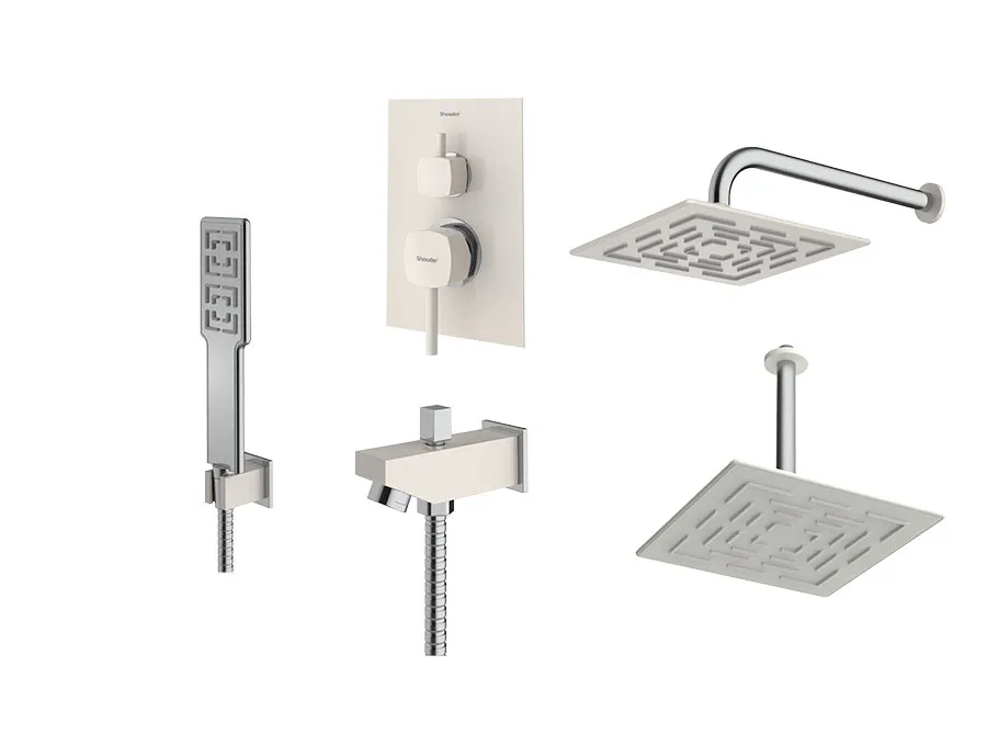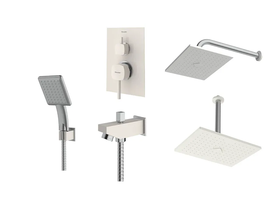 – شیر توکار حمام شودر تیپ چهار شامل : پلیت، سر دوش ثابت، بازویی سقفی، سردوش متحرک و آبریز میباشد.