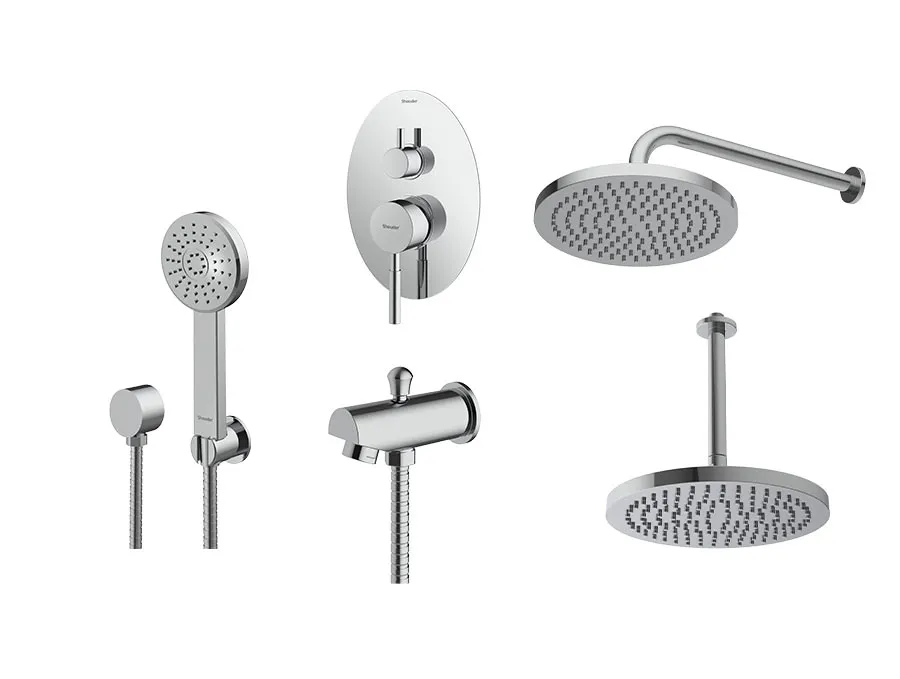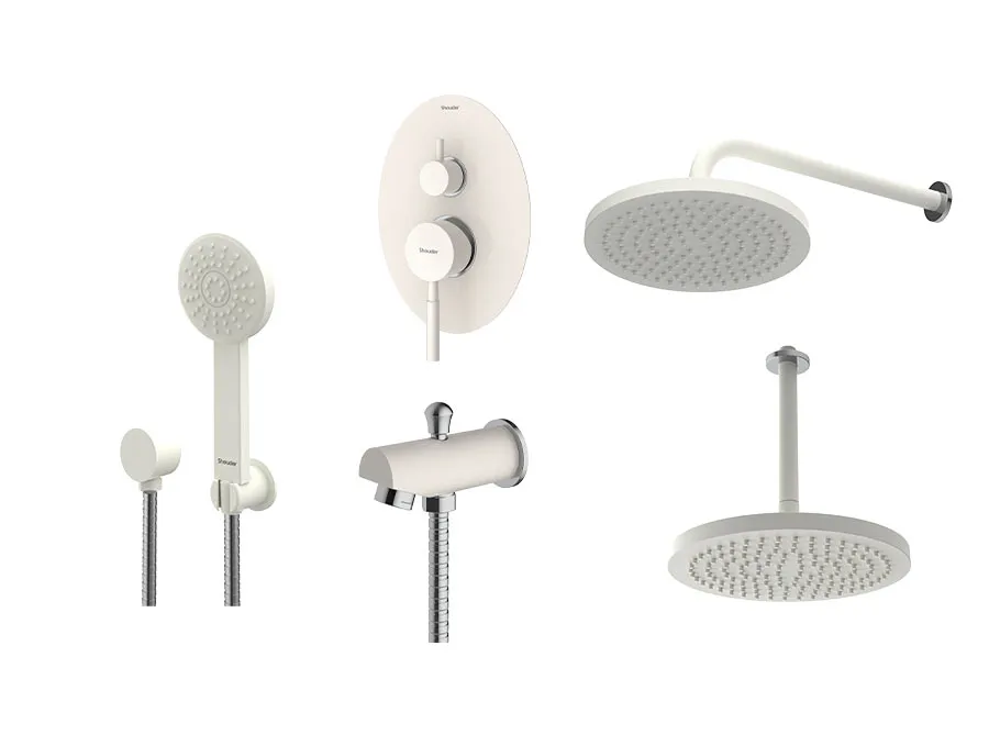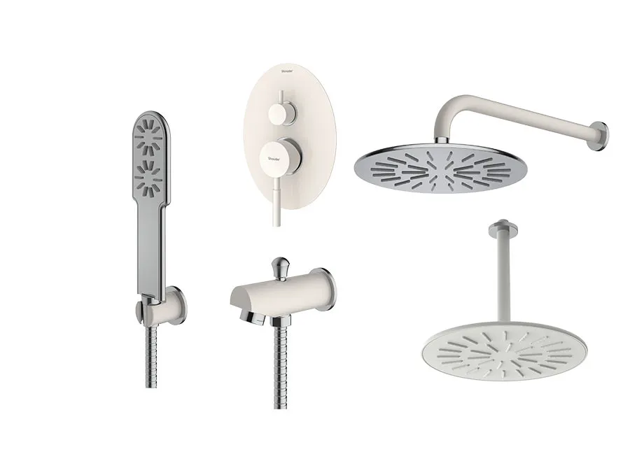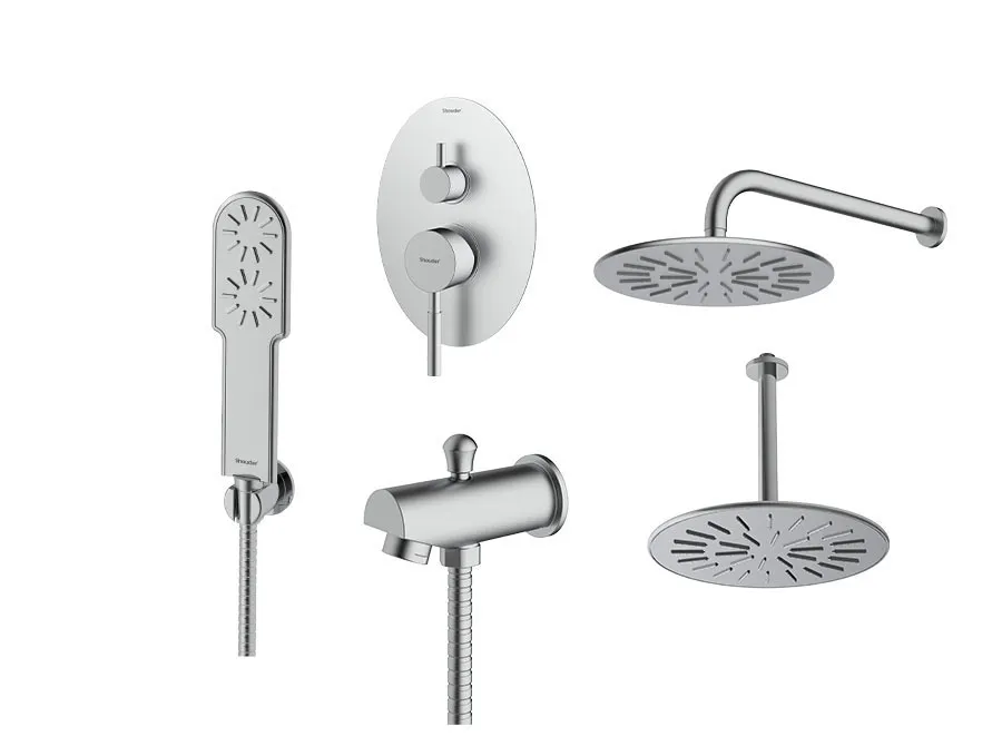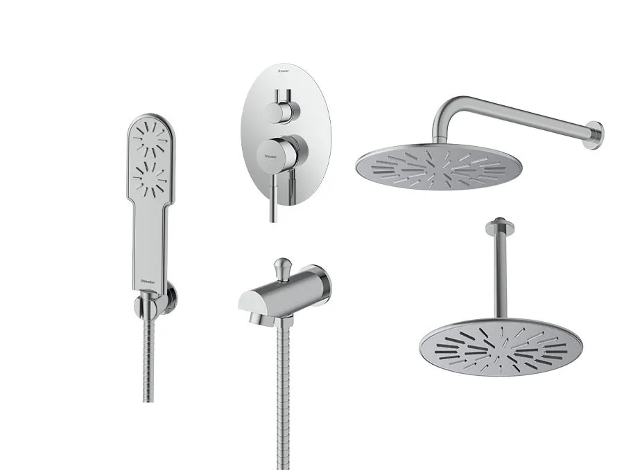 – شیر توکار حمام شودر تیپ چهار شامل : پلیت، سر دوش ثابت، بازویی سقفی، سردوش متحرک و آبریز میباشد.