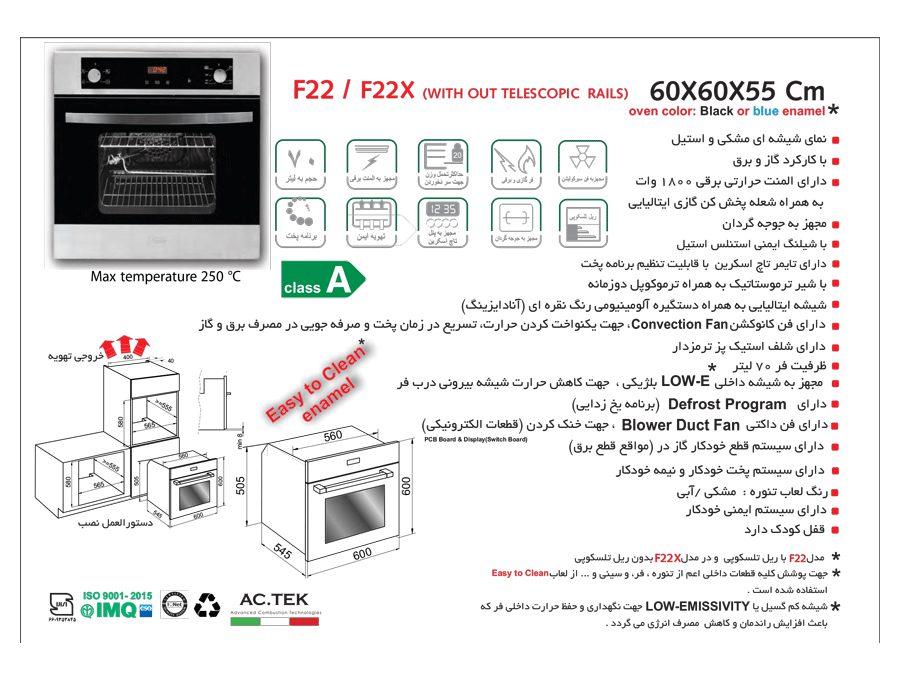 شعله پخش کن گازی ,دارای شلنگ ایمنی استنلس استیل ,شیشه ایتالیایی ,دارای شیر ترموستاتیک ,دارای سینی پخت و پز ,ترموکوپل دو زمانه ,نحوه باز شدن درب به صورت عمودی ,پوشش داخلی آسان تمیز شونده ,شیشه داخلی درب low-E بلژیک ,مجهز به سیستم قطع خودکار گاز ,مجهز به سیستم پخت خودکار و نیمه خودکار ,المنت حرارتی برقی 1800 وات ,شعله پخش کن گازی ایتالیایی AC.TEK |