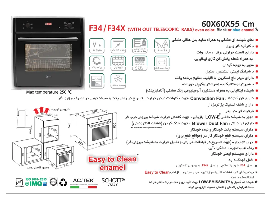 شعله پخش کن گازی ,دارای شلنگ ایمنی استنلس استیل ,شیشه ایتالیایی ,دارای سینی پخت و پز ,ترموکوپل دو زمانه ,نحوه باز شدن درب به صورت عمودی ,دارای شلف استیک پز ترمز دار ,پوشش داخلی آسان تمیز شونده ,شیشه داخلی درب low-E بلژیک ,مجهز به سیستم قطع خودکار گاز ,مجهز به سیستم پخت خودکار و نیمه خودکار ,المنت حرارتی برقی 1800 وات ,شعله پخش کن گازی ایتالیایی AC.TEK |