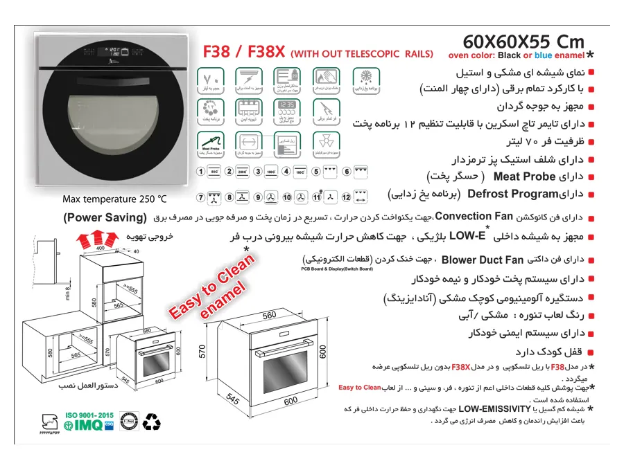 شیشه ایتالیایی ,دارای سینی پخت و پز ,نحوه باز شدن درب به صورت عمودی ,دارای شلف استیک پز ترمز دار ,پوشش داخلی آسان تمیز شونده ,شیشه داخلی درب low-E بلژیک ,مجهز به سیستم پخت خودکار و نیمه خودکار ,المنت حرارتی برقی 1800 وات |