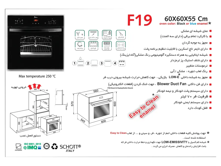 شیشه ایتالیایی ,دارای سینی پخت و پز ,نحوه باز شدن درب به صورت عمودی ,دارای شلف استیک پز ترمز دار ,پوشش داخلی آسان تمیز شونده ,شیشه داخلی درب low-E بلژیک ,مجهز به سیستم پخت خودکار و نیمه خودکار ,المنت حرارتی برقی 1800 وات |