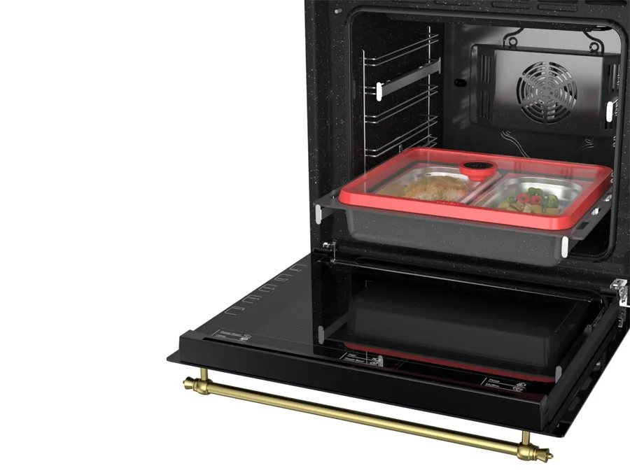 ولوم کلاسیک تاجدار ,دارای نمایشگر دیجیتال مجهز به ولوم ,مجهز به بخارپز ,قابلیت ذخیره برنامه ,عملکرد پخت سریع ,۲ عدد سینی (کم عمق و عمیق) ,پوشش لعاب داخلی آسان تمیز شونده ,۴ عدد ریل تلسکوپی |
