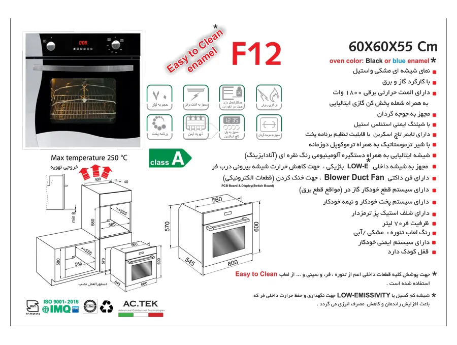 شعله پخش کن گازی ,دارای شلنگ ایمنی استنلس استیل ,شیشه ایتالیایی ,دارای شیر ترموستاتیک ,دارای سینی پخت و پز ,ترموکوپل دو زمانه ,نحوه باز شدن درب به صورت عمودی ,دارای شلف استیک پز ترمز دار ,پوشش داخلی آسان تمیز شونده ,شیشه داخلی درب low-E بلژیک ,مجهز به سیستم قطع خودکار گاز ,مجهز به سیستم پخت خودکار و نیمه خودکار ,المنت حرارتی برقی 1800 وات ,شعله پخش کن گازی ایتالیایی AC.TEK |