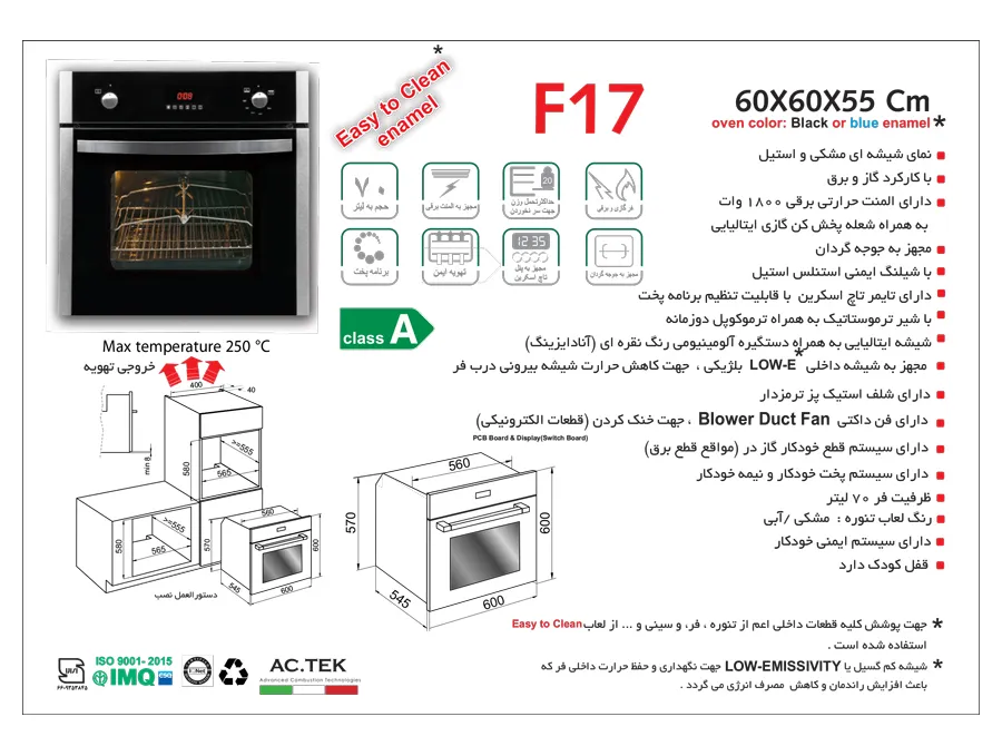 شعله پخش کن گازی ,دارای شلنگ ایمنی استنلس استیل ,شیشه ایتالیایی ,دارای شیر ترموستاتیک ,دارای سینی پخت و پز ,ترموکوپل دو زمانه ,نحوه باز شدن درب به صورت عمودی ,دارای شلف استیک پز ترمز دار ,پوشش داخلی آسان تمیز شونده ,شیشه داخلی درب low-E بلژیک ,مجهز به سیستم قطع خودکار گاز ,مجهز به سیستم پخت خودکار و نیمه خودکار ,المنت حرارتی برقی 1800 وات ,شعله پخش کن گازی ایتالیایی AC.TEK |