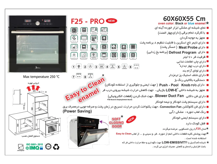 شیشه ایتالیایی ,دارای سینی پخت و پز ,نحوه باز شدن درب به صورت عمودی ,دارای شلف استیک پز ترمز دار ,دارای سینی پیتزا پز ,پوشش داخلی آسان تمیز شونده ,شیشه داخلی درب low-E بلژیک ,مجهز به سیستم پخت خودکار و نیمه خودکار ,المنت حرارتی برقی 1800 وات ,چاپ برنامه غذایی داخل درب ,دستگیره باکالیتی |