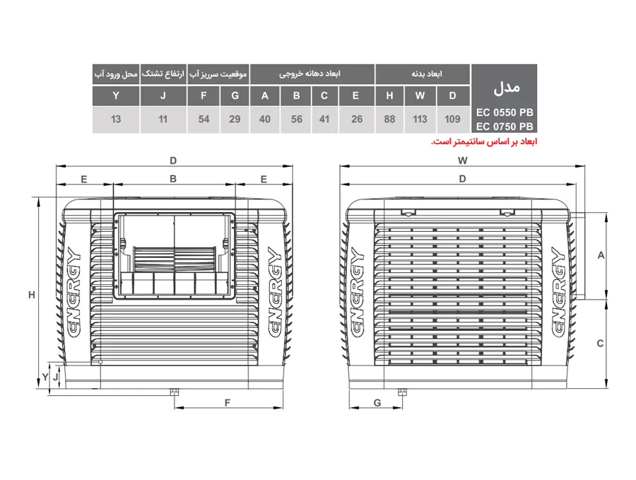 ابعاد دهانه خروجی هوا (cm) : 40-56-41 ,موقعیت سر ریز آب (cm) : 29-54 ,ارتفاع تشک آب (cm) : 11 ,محل ورودی آب (cm) : 13 ,سیستم سرمایشی تبخیری ,حداکثر طول کانال 25 متر ,رده انرژی ++A ,مساحت قابل سرمایش : 100 تا 150 مترمربع (تقریبی) |