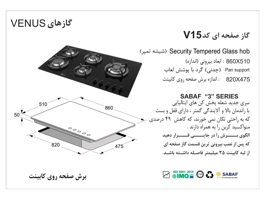 قطعات اصلی ایتالیایی ,نمای ظاهری شیشه مشکی ,دارای Vok ,دارای قفل و بست شعله پخشکن ,نوع شعله پخشکنها طرح ونوس ,نوع شعله پخشکن پلوپز طرح ونوس ,جای ولوم تخت |