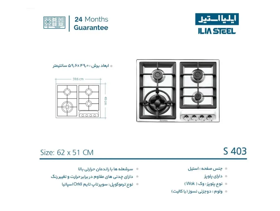 مشخصات اجاق گاز ایلیا استیل مدل S403 رومیزی