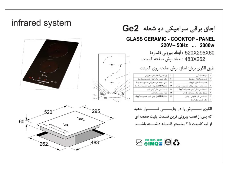 قطعات اصلی ایرانی ,نمای ظاهری شیشه مشکی ,ساخته شده با شیشه وارداتی ,نوع شعله پخشکنها Hot plate infrared ,نوع شعله پخشکن پلوپز Hot plate infrared ,دارای کنترل تاچ اسکرین ,دارای خاصیت ضد لک ,مقاومت حرارتی بالا در برابر شوک های حرارتی و ضربه ,راندمان حرارتی بسیار بالا ,قفل کودک ,تایمر زمان پخت با تنظیم حرارت 9 مرحلهای ,قابلیت استفاده تمامی ظروف ( پیرکس، چدن ، آلمینیوم و لعابی و …. |